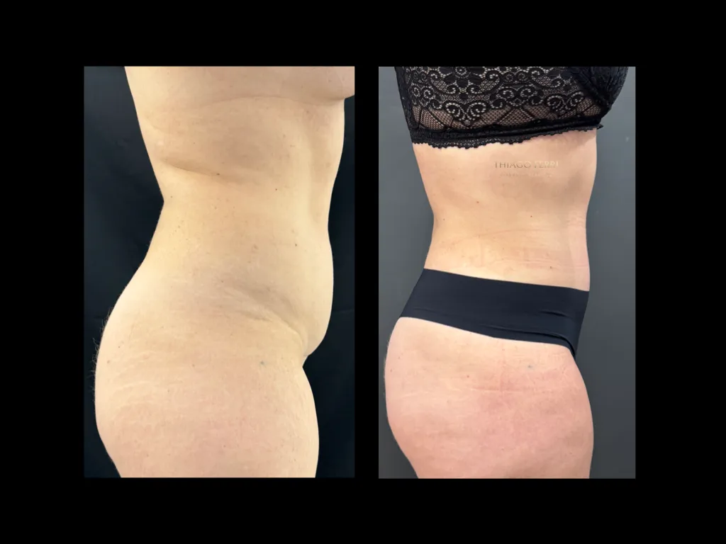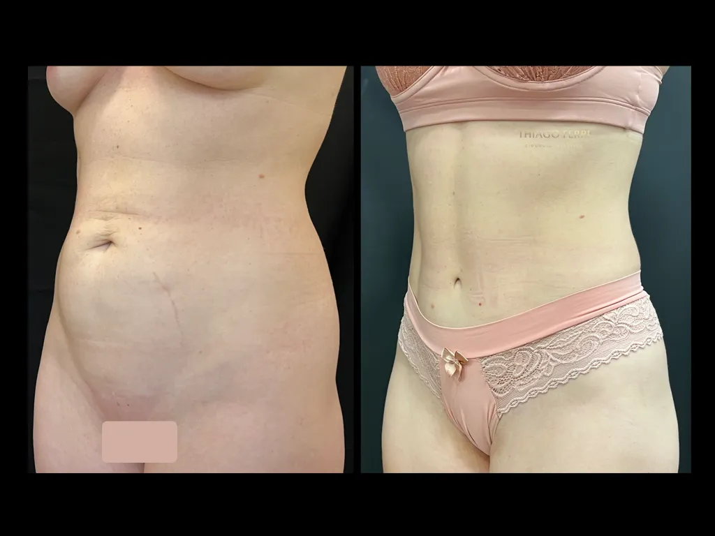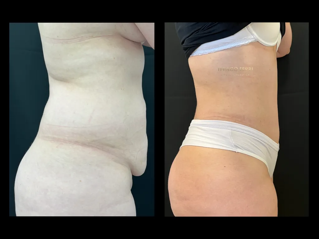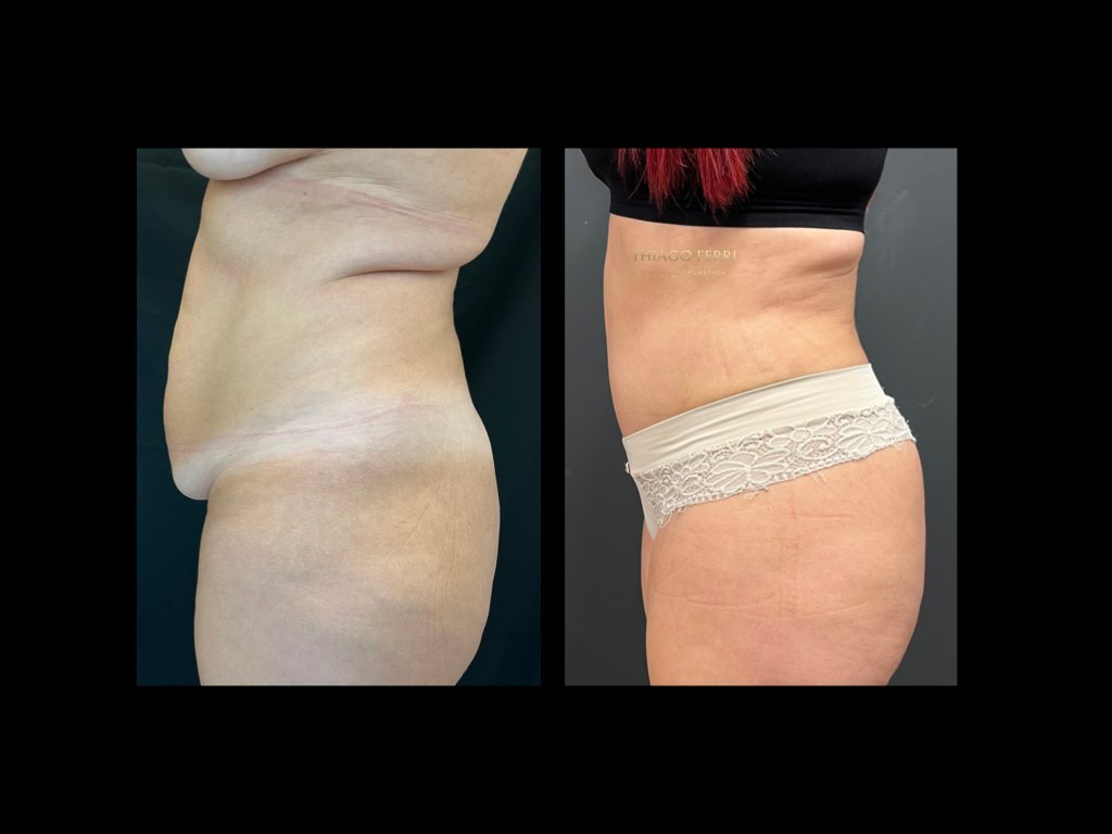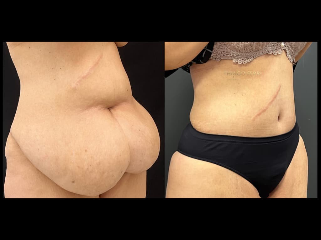 Caso I: 45 anos, mãe, cirurgia para retirada da vesícula prévia. Abdominoplastia + Lipoaspiração de abdome, flancos, 3 meses após a cirurgia.