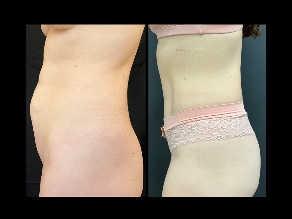 Caso E: 31 anos, mãe. Abdominoplastia + SAFER + Lipoaspiração de abdome e flancos + Argoplasma. Dois meses após a cirurgia.