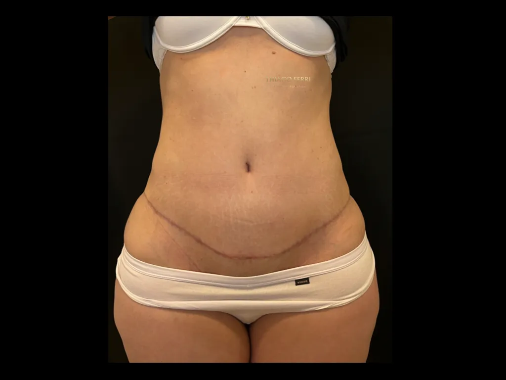 Caso C: 42 anos, mãe. Abdominoplastia + SAFER + Lipoaspiração de abdome e flancos. Um ano e 4 meses após a cirurgia.