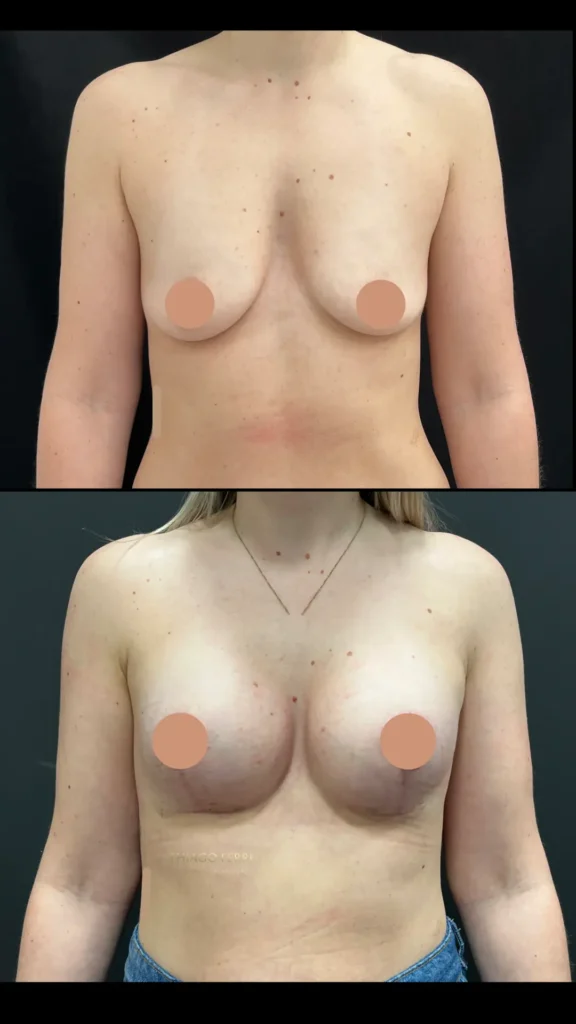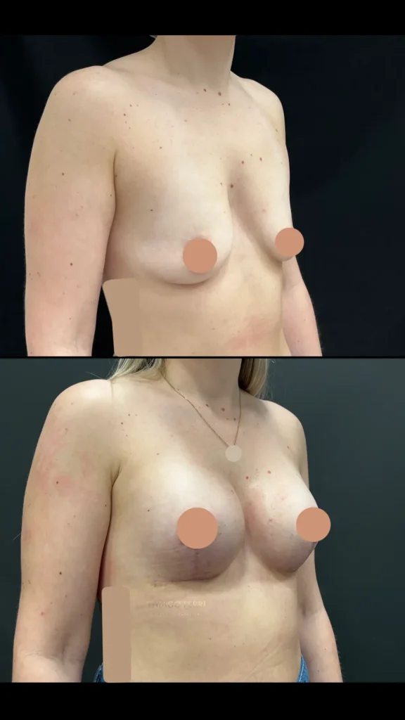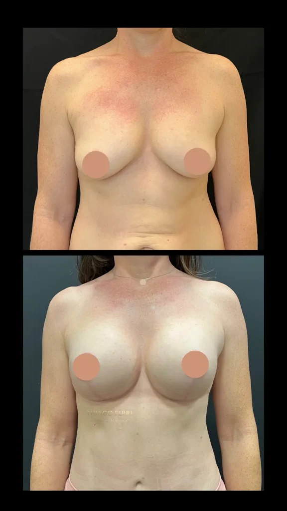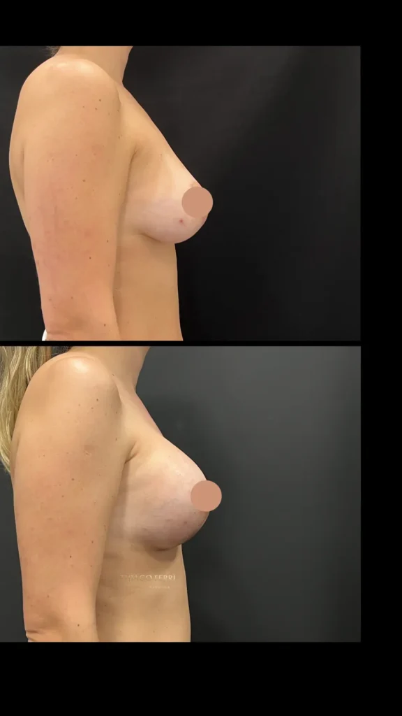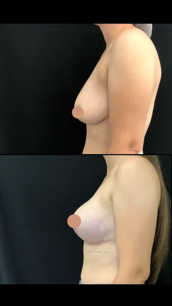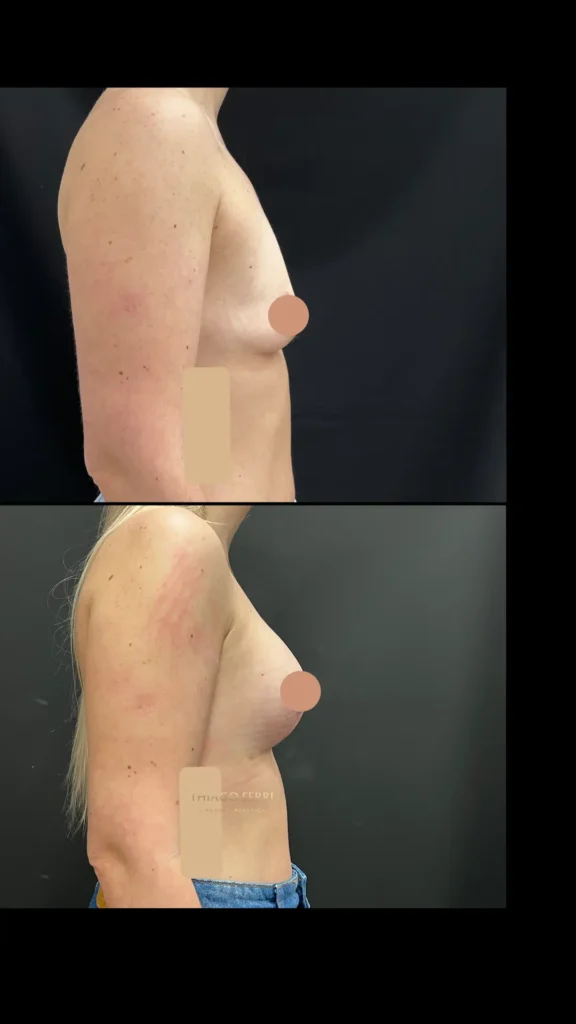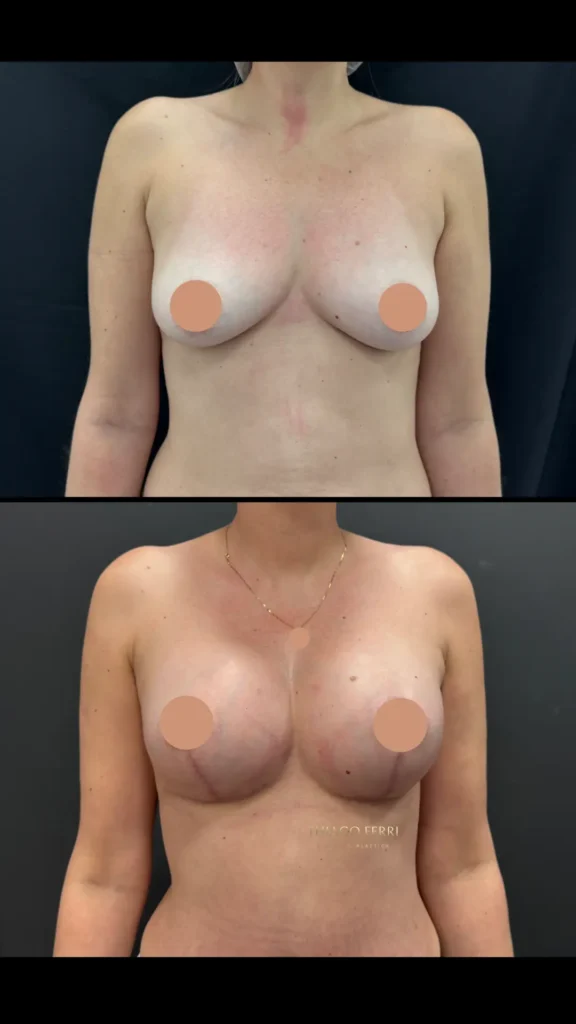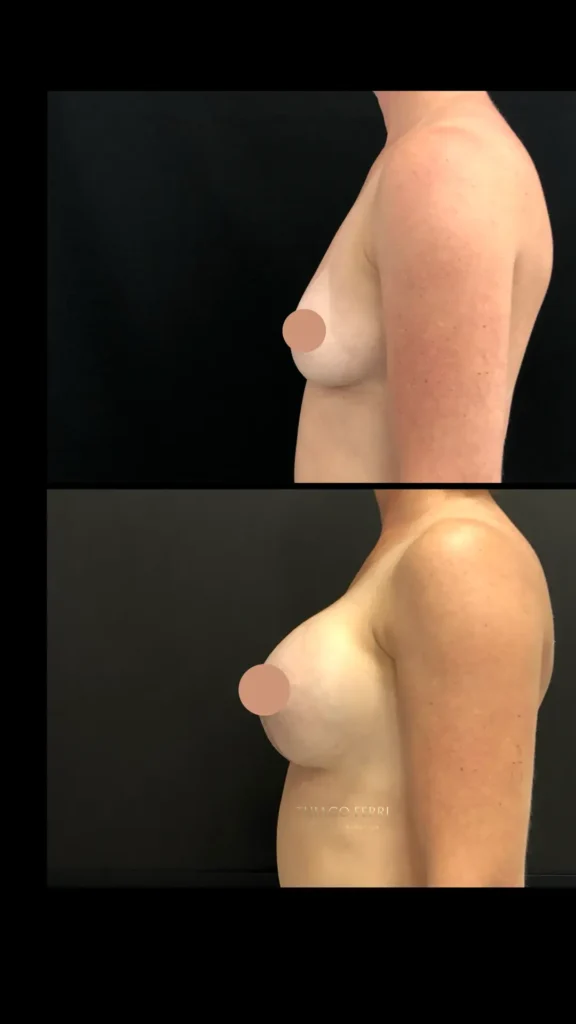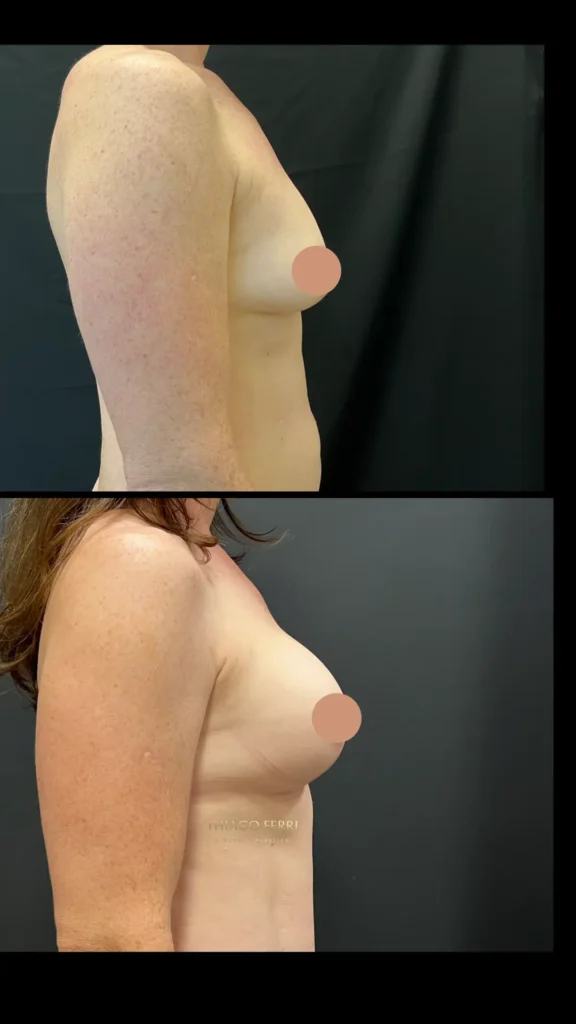 Caso A:39 anos, 1 filho. Mastopexia com implantes, dual plane (abaixo do músculo), 240ml, 2 meses após a cirurgia.