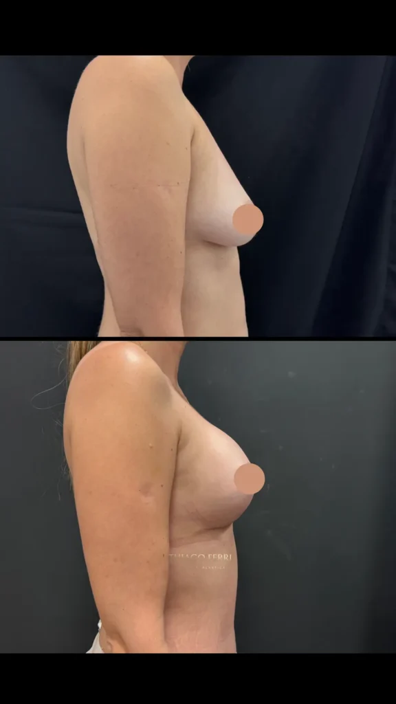 Caso L: 36 anos, dois filhos. Mastopexia com implantes, subfacial (acima do músculo), 355ml, um mês após a cirurgia.