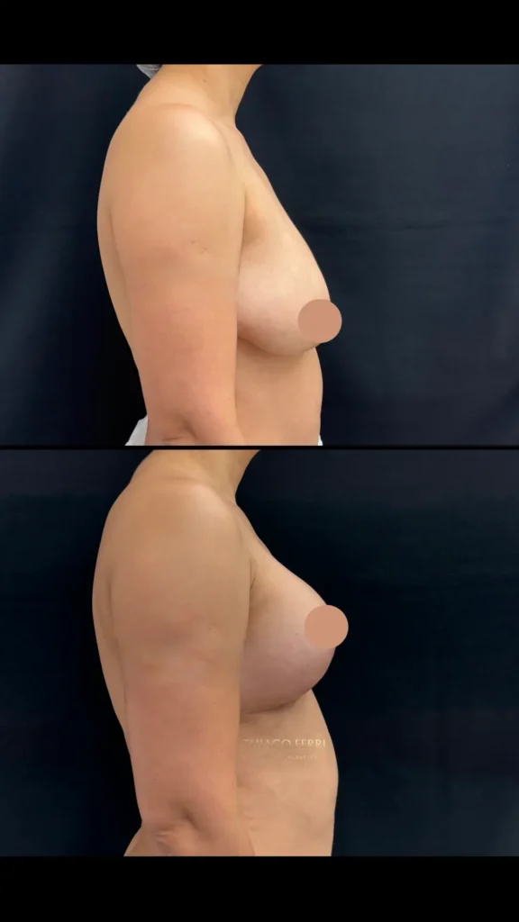 Caso F: 30 anos. Mastopexia com implantes, subfacial (acima do músculo), 295ml, dois meses após a cirurgia.